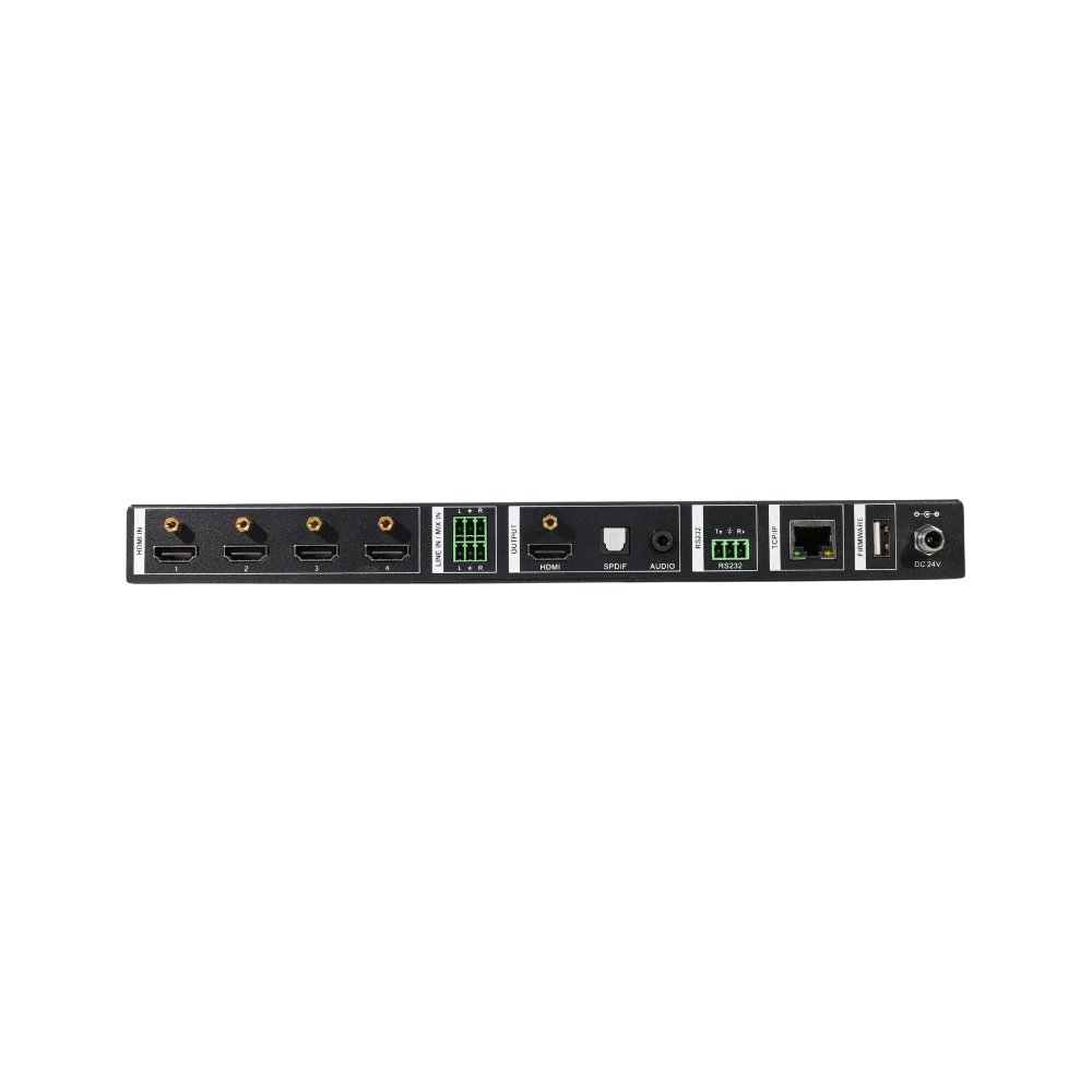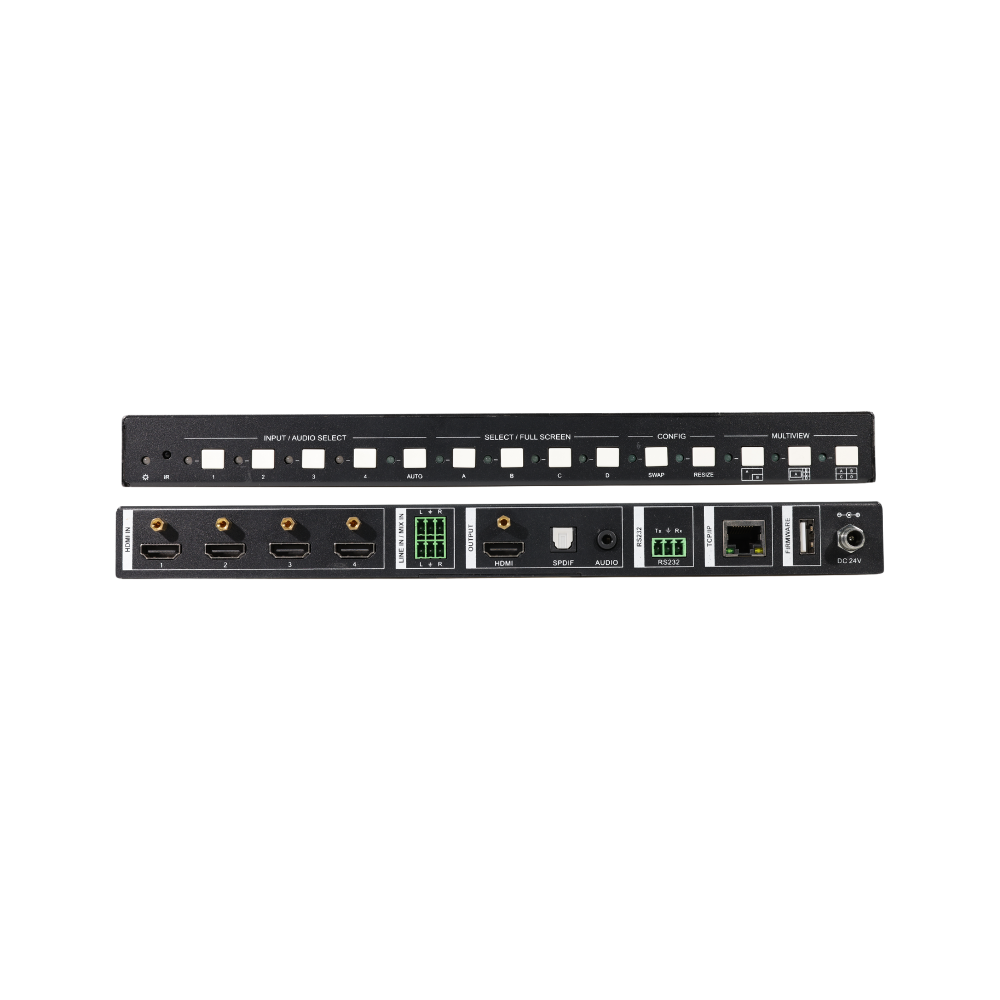 The 4K Multi-View Switcher is a seamless video scaler designed to deliver a true 4K display experience. This versatile switcher comes equipped with four HDMI inputs and one HDMI output, allowing you to simultaneously display four video sources on a single screen. For audio processing, the switcher offers a line input, one mix input, one SPDIF output, and one analog output. One of the standout features is the ability to design custom multiviewer layouts, giving you full control over how content is displayed. Control options are robust and user-friendly, whether you’re using the front panel, remote control, RS232 commands, or the comprehensive web-based GUI.